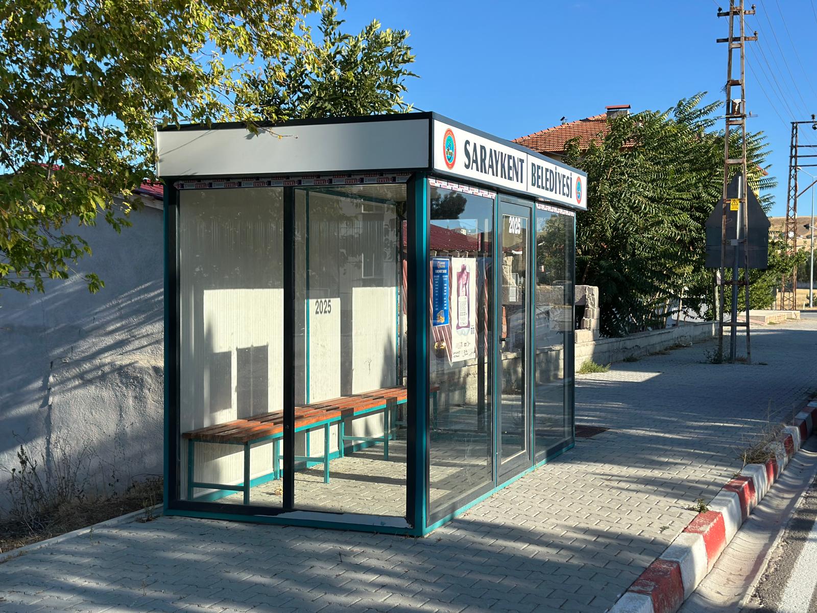 Çelik konstrüksiyonlu, cam panelli modern belediye otobüs durağı